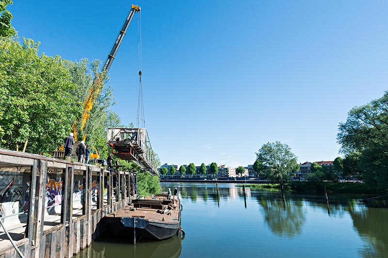 Met een hoogte van 25 meter, een giek van 38 meter lang en een gewicht van ruim 50.000 kilo kan gerust gezegd worden dat het om een forse kraan gaat. De kraan is in Angeren deels gedemonteerd. Vanwege de lengte en gewicht is de giek op dinsdag 14 mei over het water vervoerd naar de Stadsblokkenwerf. De overige delen van de kraan volgen op een later moment.
