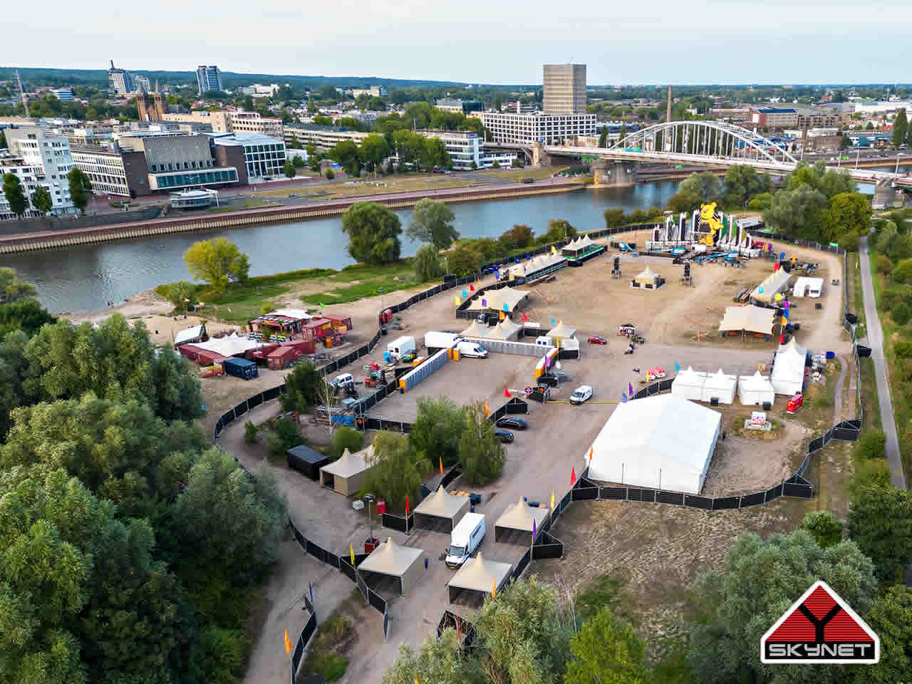 Organisatie is op donderdagavond nog druk bezig om het festivalterrein in te richten waar aankomende zaterdag zo’n 8000 bezoekers kunnen genieten van ‘klassieke’ muzikale dreunen uit de jaren 90. Beeld: Skynet