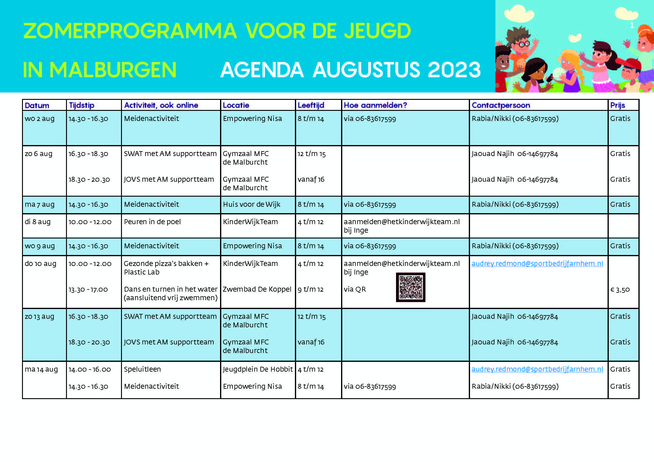 De zomervakantie is vandaag begonnen en dat betekent ook dat er weer een fantastisch zomerprogramma voor alle kinderen in de wijk Malburgen, Immerloo en Het Duifje is georganiseerd. Het gehele programma van maandag 17 juli tot en met woensdag 20 augustus, dat door verschillende organisaties uit de wijk is samengesteld vindt je hieronder, in de nieuwe online wijkagenda (vanaf 20 juli) en in de wijkkrant Malburgen.nl.