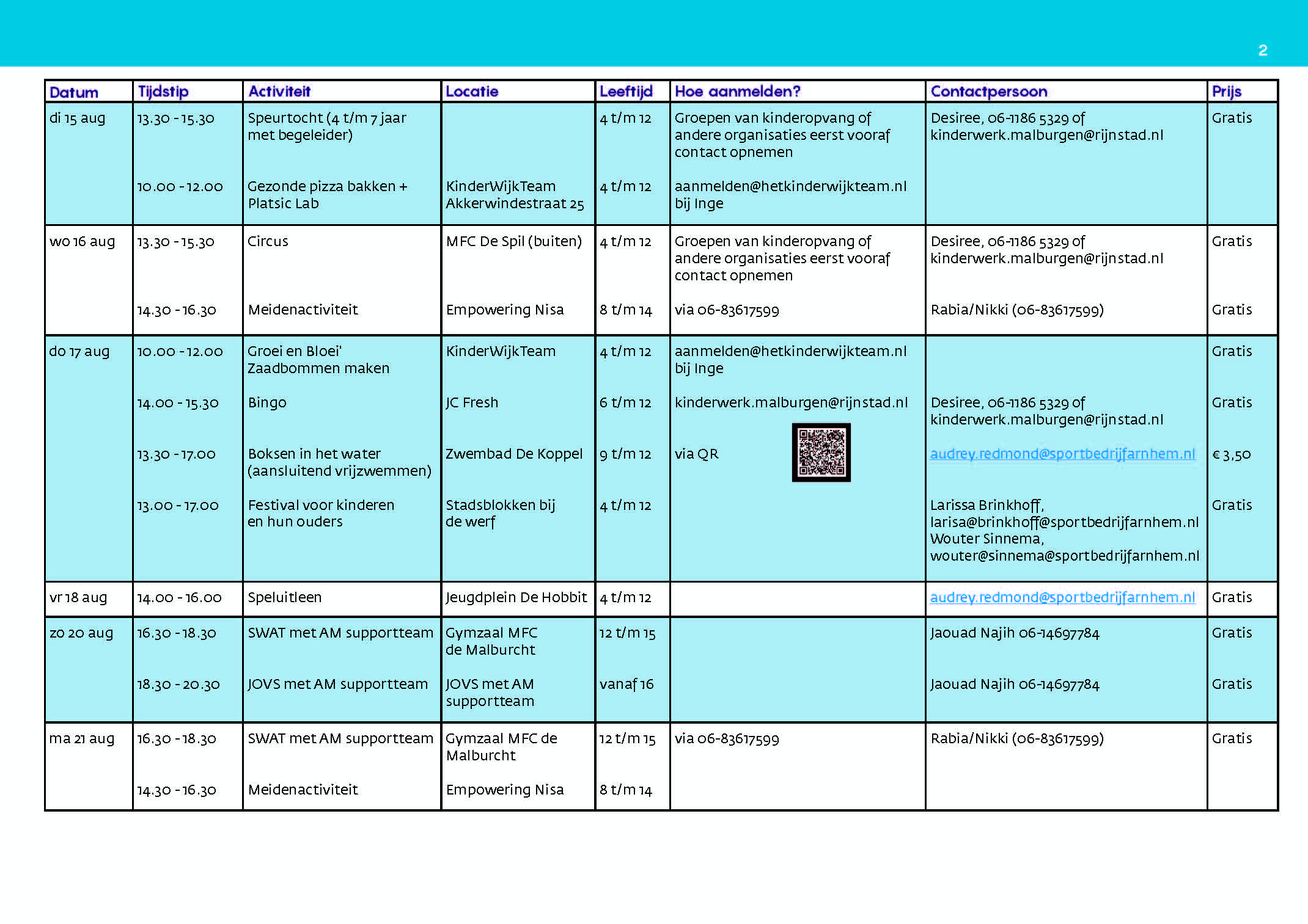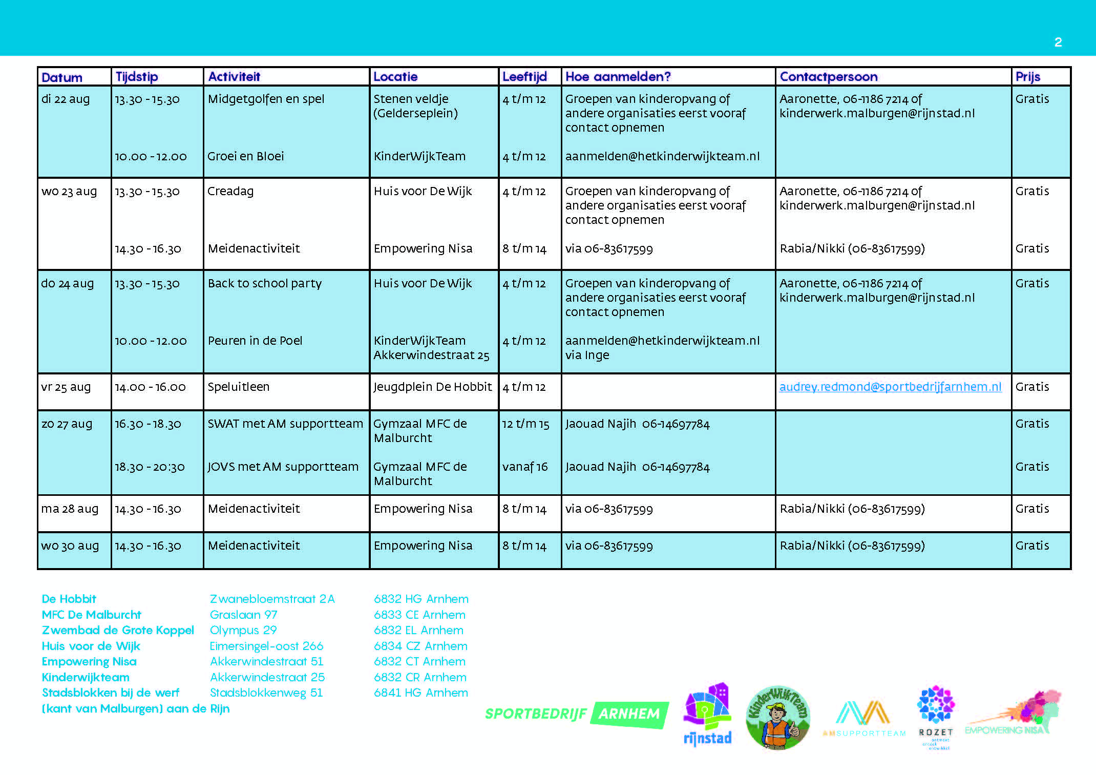 Er zijn zoveel activiteiten voor, jongens en meisjes, en voor jongere en oudere kinderen georganiseerd en op zoveel verschillende locaties in de wijk dat je zelf hieronder in het schema (ook hier te downloaden als PDF) maar moet kijken wat er allemaal te doen is.