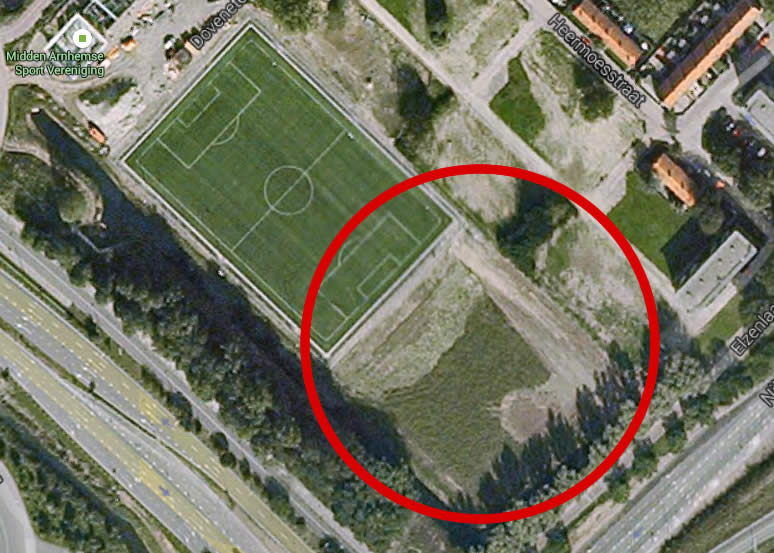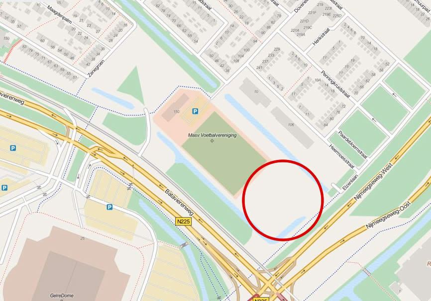 Het gaat om het stuk terrein tussen de Nijmeegseweg en de achterzijde van het hoofdveld van voetbalclub MASV, met aan de zijkant de Heermoesstraat. Zie de locatie hieronder op de overzichtjes (klikken = grotere versie.)