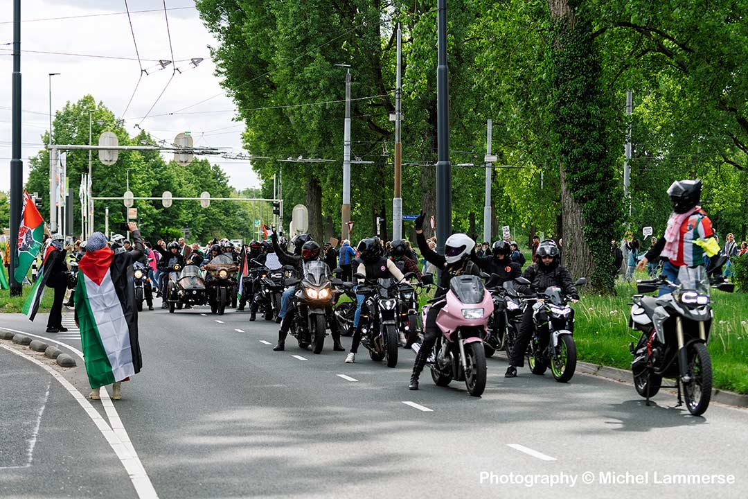 De stoet volgde het fietspad over de brug richting het De Monchyplein. Niet alleen de motoren lieten van zich horen; ook automobilisten die de demonstratie passeerden, toeterden ter ondersteuning.