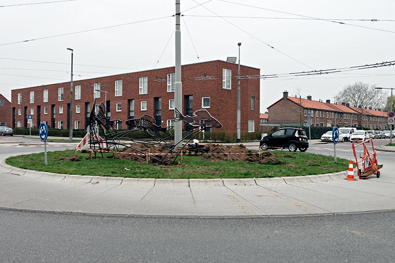Voorlopig staan de eerste vijf vissen er op het middenstuk van de rotonde. De overige acht vissen zullen in de loop van de komende weken worden geplaatst in het water en aan de waterkanten van beide wijkdelen.