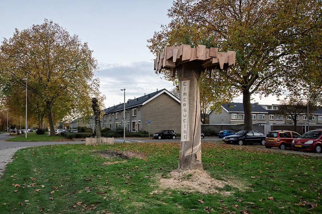 Het idee ontstond vorig jaar bij wijkbewoner Frans, deelnemer aan de wijkbeheergroep Malburgen Oost-Zuid. Hij stelde voor om een dode boom aan de Eimerssingel-West te behouden en om te vormen tot een zogenaamde ecostam. Samen met het bedrijf Stouthout werd het plan uitgewerkt en in overleg met de gemeente Arnhem uitgevoerd. Het resultaat is een ecostam en een combinatie van een welkomst- en afscheidselement voor de buurt Eimersweide.