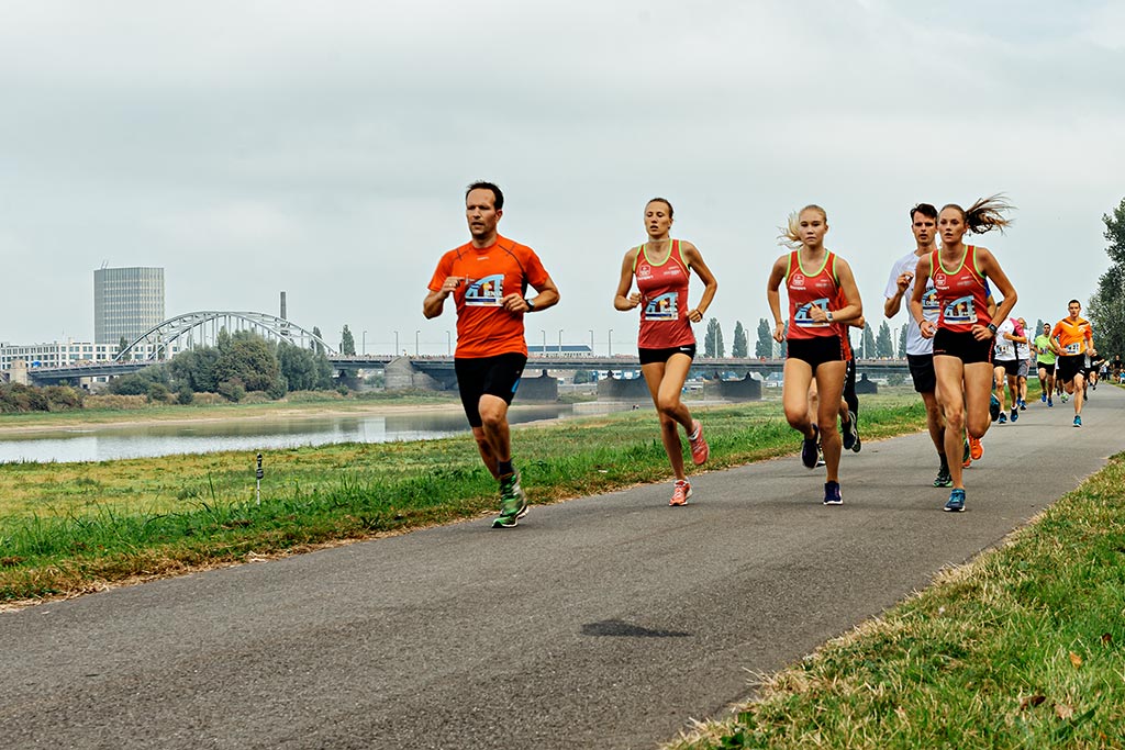 Deelnemers aan de Bridge to Bridge Run tijdens een eerdere editie in de Malburgse uiterwaarden op de Bandijk